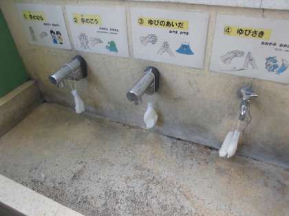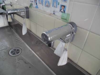 LEDの工事と並行して、自動水栓の工事も進めています。各階の教室横の水道が、手を出したら自動で水が出るようになりました。これで節水になるように、蛇口のときを同様に、正しい使い方をしていきます。