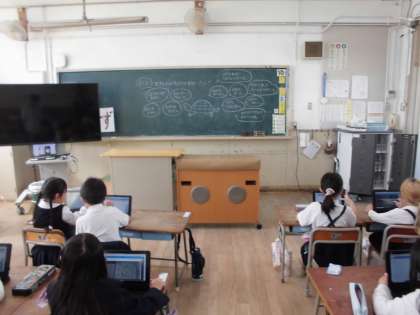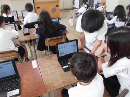 1年生はタブレットを使って写真を加工しています。ずいぶん上手に使いこなすようになりました。生活科では、「もしも生き物の気持ちがわかったら」という題材で、どんなことを話すかなと考えて吹き出しに書きました。個性豊かな、楽しい気持ちが現れました。