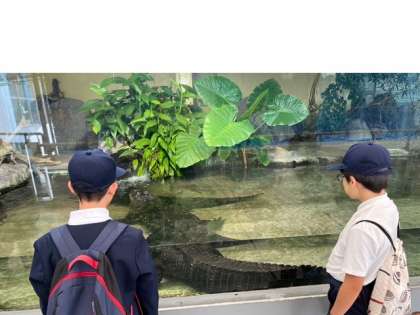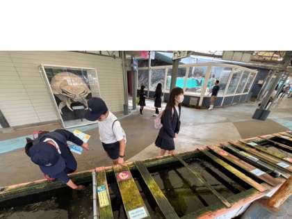 班活動がはじまりました。大きなワニですね。鳥羽水族館には実際に生き物に触れる場所もあります。何を触っているのかな。