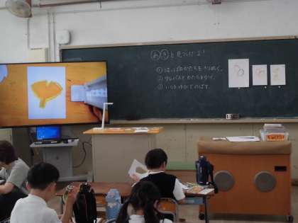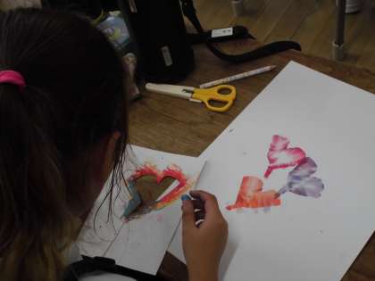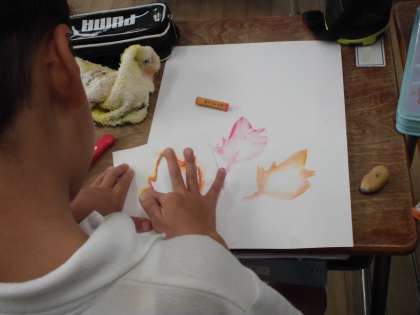 1年生は図工で「秋をみつけよう」の学習をしています。葉っぱの形にくりぬいた画用紙のフチにクレパスで色を塗り、内側に指でぼかす「ステンシル」の技法を使って、紅葉した秋の葉っぱを表しています。きれいな葉っぱが次々できていくと「先生見て。」と嬉しそうに見せてくれました。