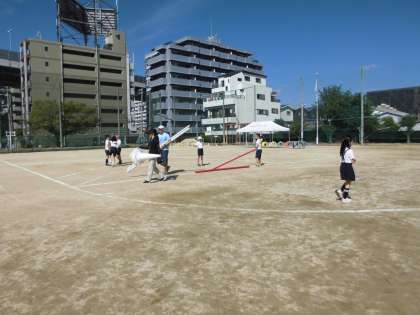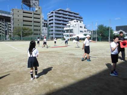 4年生は団体競技で「台風の目」を行います。コロナ禍で団体競技が行われていなかったので、4年生にとっても初めての「台風の目」の体験です。長い棒をもって上手に走るのを練習しています。