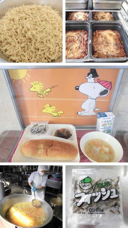 献立は、なすのミートグラタン・鶏肉とキャベツのスープ・ミニフィッシュ・おさつパン・牛乳でした。