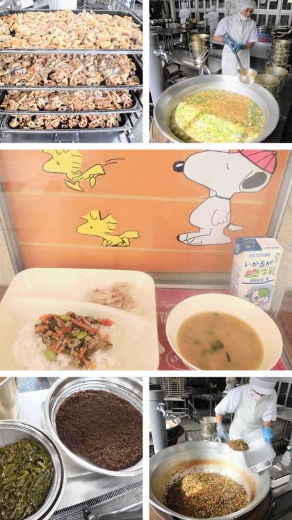 献立は、もずくと豚ひき肉のジューシー・さつまいものみそ汁・焼きれんこん・ごはん・牛乳でした。