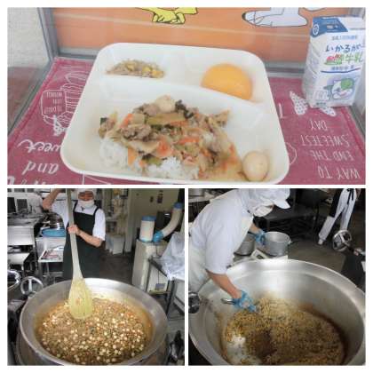 中華丼は、豚肉・うずら卵・はくさい・たまねぎ・たけのこ・にんじん・しいたけ・にらを使用しています。しょうがを香りよくいためているので、しょうがの風味がきいていました。