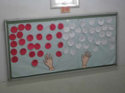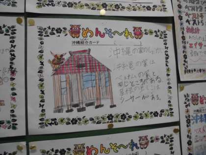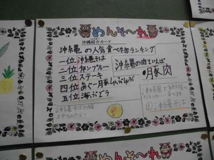 この時期、廊下掲示も運動会に関するものがたくさんあります。2年生は玉入れをモチーフに、自分たちの思いを書き込みました。4年生は沖縄について調べたことが掲示されています。