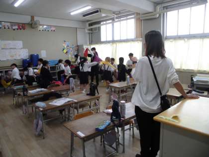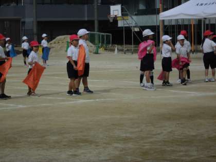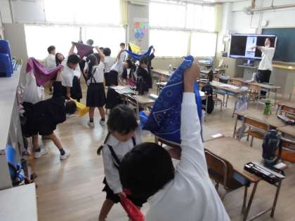 1年生の団体演技はバンダナを使って行います。運動場でバンダナがひらひらしてとても素敵です。教室でも細かいところを復習ながら、がんばって踊っています。