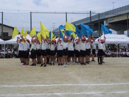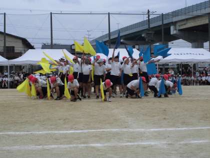 6年生の団体演技です。はじめ数人ずつ入場してきて、真ん中に一つに集まりました。旗があがると花が開いたようにきれいでした。