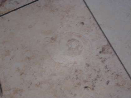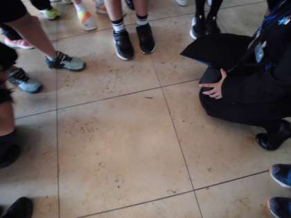 係の人から「床にひいてある敷石から化石が見つかるよ」と言われて、楽しそうにさがし、イカの化石やアンモナイトなどたくさんの化石を見つけました。