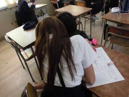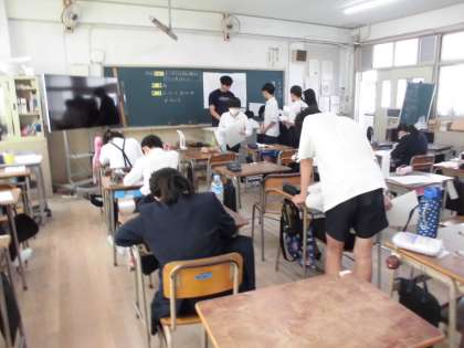 6年生は算数で「比例」の学習をしています。グラフから読み取れることを、xとyを使って比例の関係に表しています。友だちと教え合いながら、学習しています。