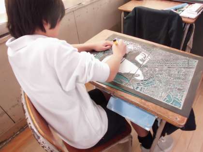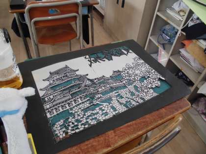 6年生では作品展に向け切りえの学習をすすめています。ずいぶんと仕上がってきています。細かくてたいへんな仕事ですが、とても根気強く続けています。