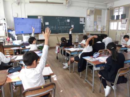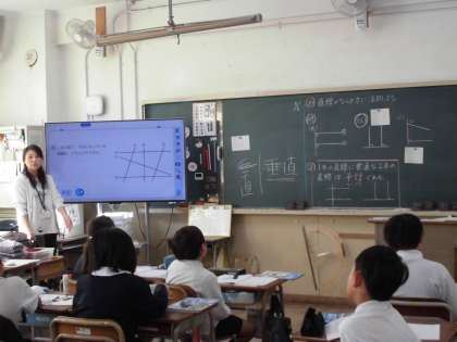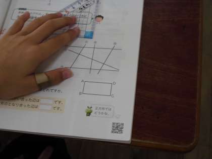 4年生は算数で「平行と垂直」の学習をしています。三角定規を使って交差する線の中から垂直を探したり、きれいに垂直を書いたりする学習です。