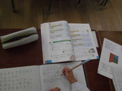 1年生は算数で繰り下がりのあるひき算の学習をしています。ブロックを使って10のまとまりから引く数をひき、余った数と一の位を合わせると答えになることを説明しています。黒板で考え方を上手に説明できていました。