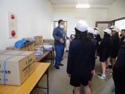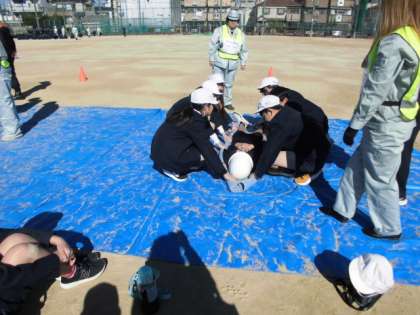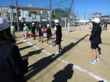 運動場で、全体でお話を聞いた後、備蓄倉庫見学・バケツリレー・水消火器訓練・搬送訓練など、各コーナーをまわって体験しました。どのコーナーも一生懸命取り組みました。