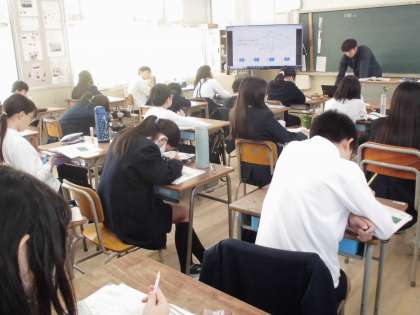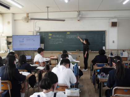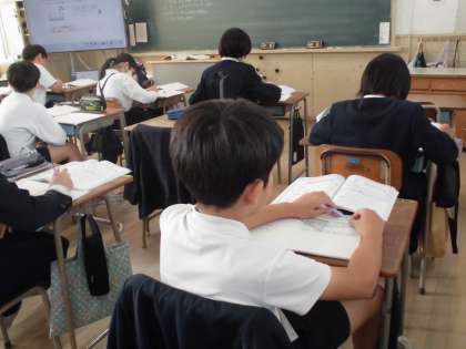 6年生は算数で2つの量をxとyと表し、1分あたりに入れる水の量と水を入れる時間との関係を表に表しています。xにともなってyはどのように変化するのかを考えています。二つの量の関係を見つけ出す、なかなか難しい学習です。