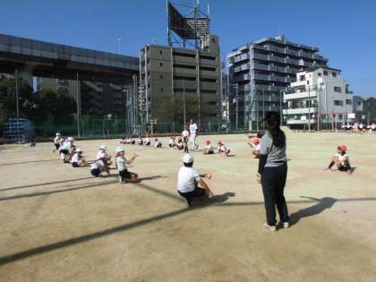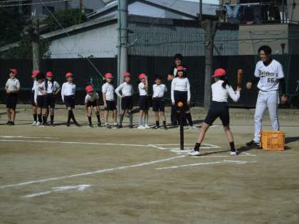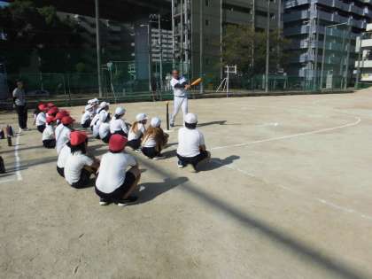 4年生は体育でオリックス出前授業を体験しました。オリックスの講師をお招きし、キャッチボールやバッティングの基礎を教えていただきました。オレンジ色の特徴あるボールで学習しました。楽しい学習でした。