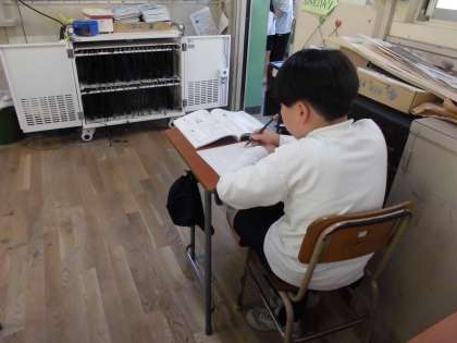 5年生は国語で「提案します。一週間チャレンジ」の学習をしました。普段の生活の中で紺のことがんばるといいよということを見つけて、みんなに提案する文章を書いています。みんな「落とし物なし週間」や「そうじをがんばろう」などよく考えた内容を書いていました。