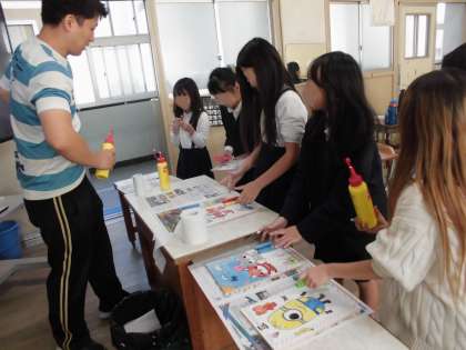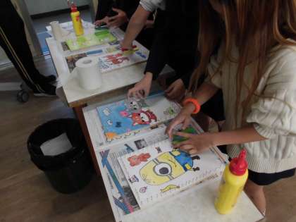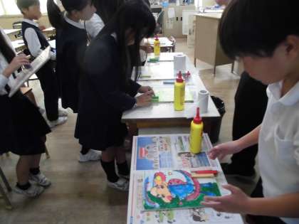 3年生は図工でコリントゲームの製作をしています。色を塗ってかわいい板面が出来上がりました。