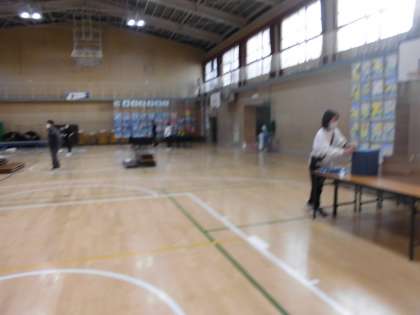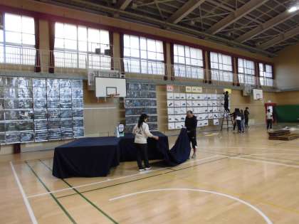 作品展が21日から始まります。子どもたちが下校した後、講堂で作品展の準備を行いました。図画は講堂の壁一面に吊り下げました。工作を並べるステージを各学年で作っていきました。次の日は、子どもたちの工作の作品を運び入れます。