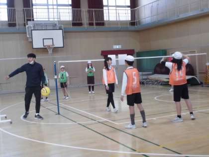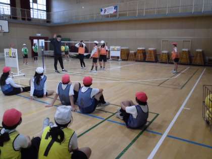 6年生は体育でソフトバレーボールの学習をしています。ルールを聞いてこれから試合です。初めての学習なので、「床にワンバウンドしても1回はOKにしよう」など、はじめは子どもたちが楽しめるような簡単なルールで行います。子どもたちは、試合をとても楽しんでいました。