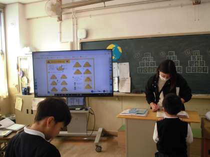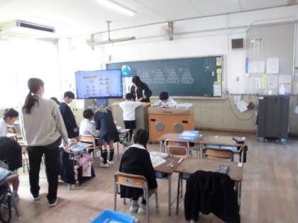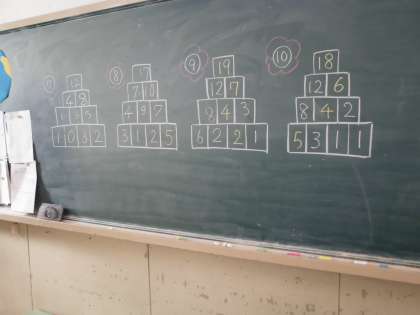 1年生は算数で「計算ピラミッド」を学習しています。今まで学習した計算を使ってピラミッド型になった計算問題をといています。友達と教え合いながら、計算しています。