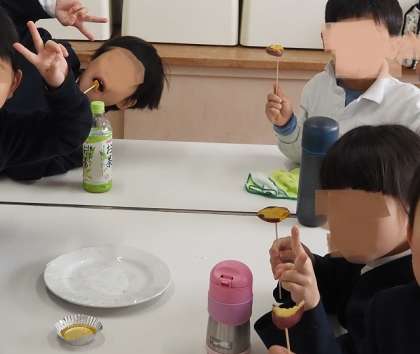 2年生は生活科で先日、ずっと大事に育てていたいもをほりました。ほったいもをいよいよゆがいて焼いてたべました。あっという間にお皿が、からになりました。「おいしい」といいながら、素敵な笑顔でモリモリ食べました。
