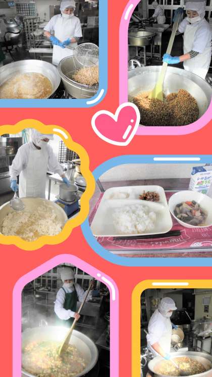 じゃこ豆は、ゆでたちりめんじゃこ・でんぷんをまぶして油で揚げた大豆に、甘辛いタレをからませます。かみごたえのある児童に人気のある献立です。