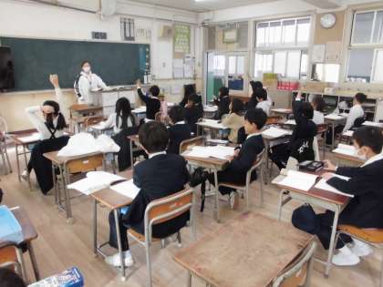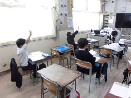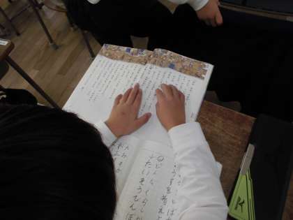 2年生は国語でかさこじぞうの学習をしています。おじいさんが菅笠を町に売りに行く場面の学習です。「町まで来るとあちこちで、いろいろなものを売っている姿が見えるね。どんなものが売られているかな。」という先生の質問に手を挙げて答えていました。先生の「昔はインターネットでぽちっと家から売られへんかったんよ。町までわざわざ出かけていって売ってたんやよ。」という声掛けから、子どもたちも若い先生たちもIT社会に生きているんだと感じました。