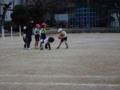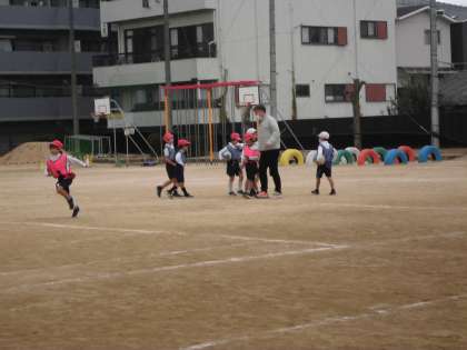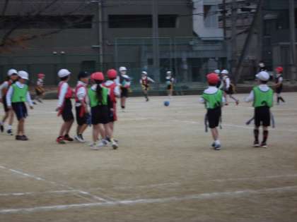 2年生は体育でボール運動をしています。チームに分かれてゲームをしました。