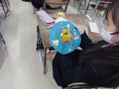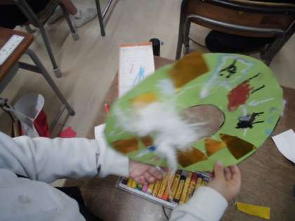 1年生はクリスマスリーズづくりをしました。緑の輪に切った画用紙に好きな形を色画用紙や色紙で貼ったり、クレパスで絵を描いて完成です。友だちと見せ合ったり、話したりして作りました。