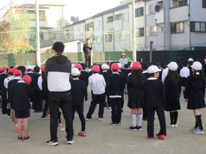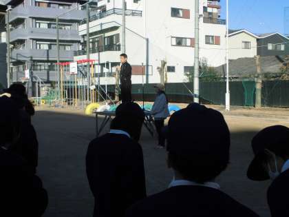 運動場で児童朝会がありました。終業式を前に、2学期がんばったことはどんなことかな?というお話がありました。寒い中、しっかりと朝会で校長先生のお話がきけました。