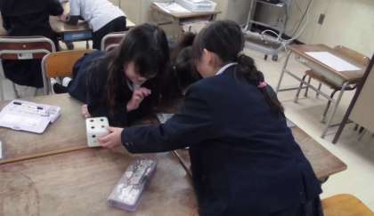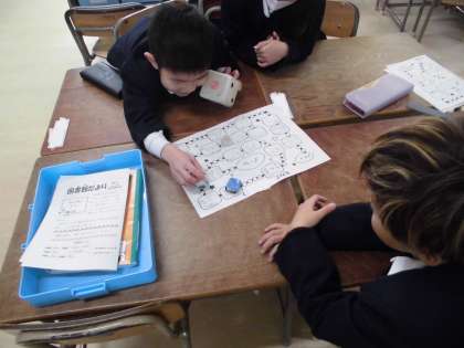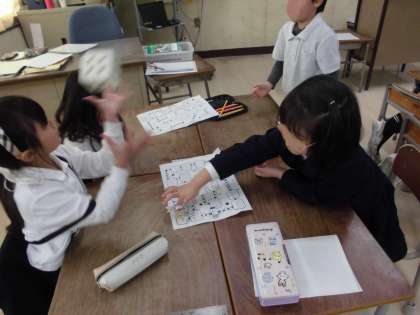 1年生はさいころゲームをグループでやっています。最近では、スマホやゲーム機でのあそびが主流ですが、さいころを使って消しゴムをコマにして、みんなで囲んで楽しく進んでいくこのような遊びの経験も大切に思います。