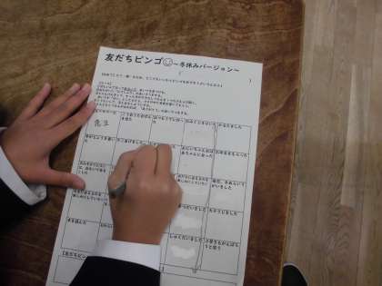 教室では、冬休みの楽しかった出来事をペアで話したり、冬休みビンゴを楽しんだりしていました。久しぶりに友だちや先生と出会えて、みんな嬉しそうでした。