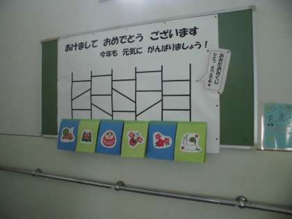 時間割を配ったり、お手紙を配ったりもしました。廊下掲示もお正月らしいものです。