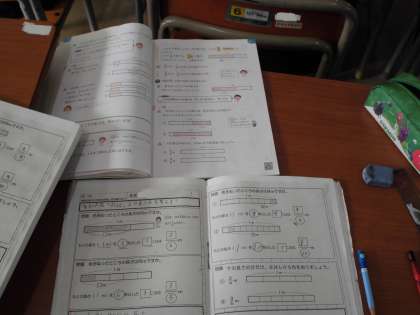 3年生は算数で分数の学習をしています。テープ図を使って等分した長さの何個分かを考えています。元の長さを1としていくつ分か、分数の考え方は子どもたちが少し戸惑うところです。