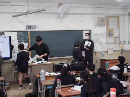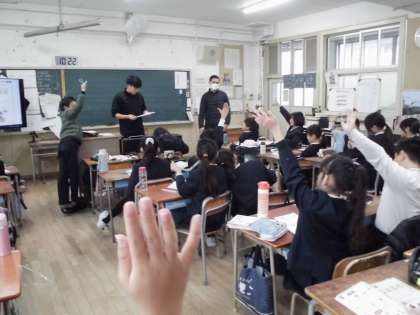4年生は外国語活動で絵カードを見て、英単語を言い合うゲームをしていました。先生から絵カードを引いて、お互いに見せ合って、先に英単語を言えた人が勝ちというゲームです。「やりたい。」と積極的に手をあげる子どもたちがたくさんいて、楽しく英単語を言い合える活動ができました。