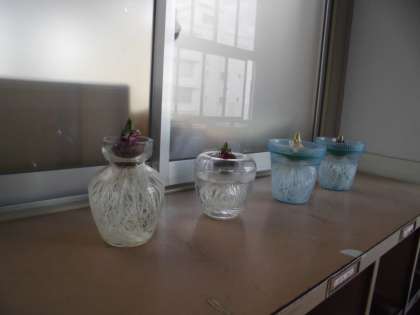 1年生の教室で育てているヒヤシンスの球根がずいぶん大きくなしました。花を咲かせるのが楽しみです。