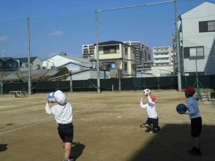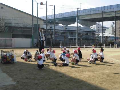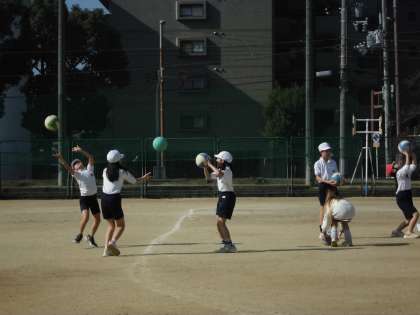 3年生は体育でおにぎりキャッチの練習をしています。「おにぎり」というのは左右におにぎりの形に三角に開いてトスをする練習です。バレーボールの基礎を学習しています。頭上で上手にボールを扱うことができるように頑張っています。