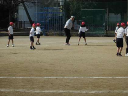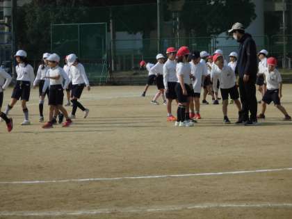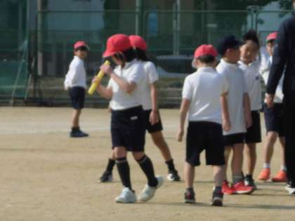 2年生は体育でリレーの練習をしています。バトンを渡す練習では、縦に並んで受け取ることを何度も練習しました。うまく渡せるようになるかな。