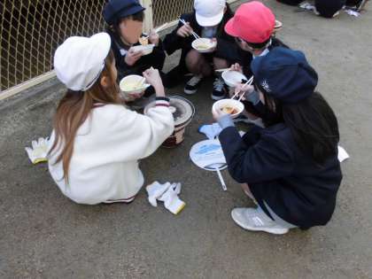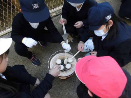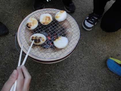 炭に火がつくとあみに餅をのせて焼きました。おいしそうな焼き色がついてくると大喜び。焼きあがったら、さとう醤油をつけて食べました。小さな丸餅1つずつだったので、「先生、もっとほしい。」と、たくさんの子どもたちが言っていました。