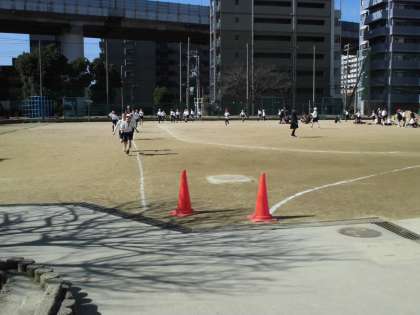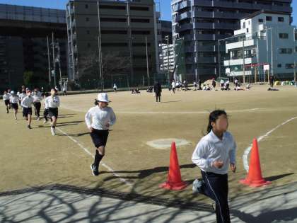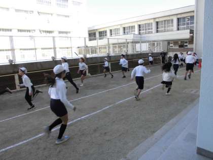 4年生は体育でマラソンを行いました。4年生はできるだけ長い距離を走ろうと、プールの横、職員室前の場所にもラインを引いて走りました。一生懸命走っていました。