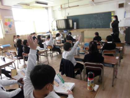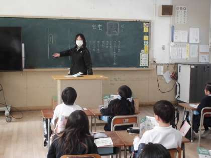 1年生は自転車に乗るときの約束の学習をしました。「自転車を降りるときにはどちらに降りるといいの?」の正解は左側です。「右側に降りると道路の方に降りちゃうから、車が来ると危ないね。」と黒板に図を書いて先生が説明をしました。
