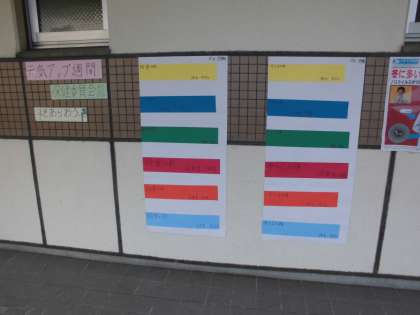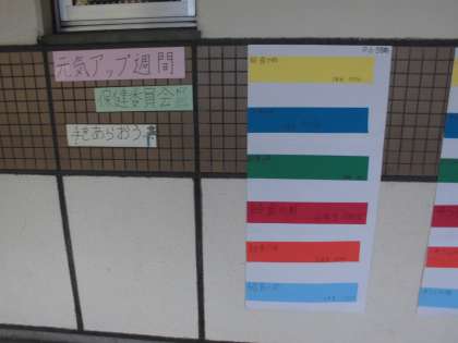 元気アップ週間のアンケート結果を講堂前に掲示しています。今回も給食の前や掃除の後の手洗いをどの学年も頑張っていました。