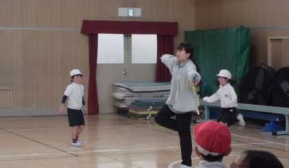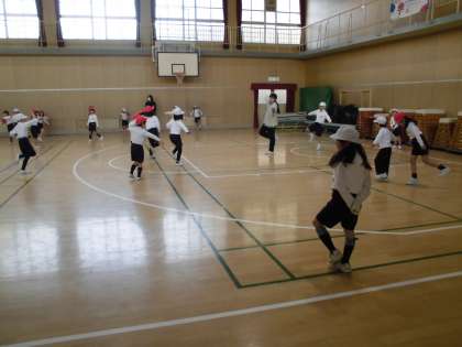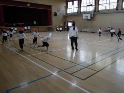 1年生は体育で楽しい運動をしていました。鬼ごっこみたいに走り回って逃げているのかと思うと、先生がホイッスルを鳴らすと、みんなが手を広げてピタッと止まります。また、音が鳴ると一斉に走り回っていきます。すごく楽しそうで、全身運動にもなる動きでした。みんなとてもいい笑顔です。