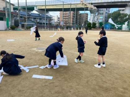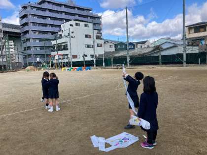 1年生は生活科で凧を作りました。この日は作った凧を運動場であげてみました。お友達と糸と糸がからまる場面もありましたが、楽しく凧あげができました。
