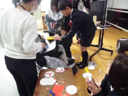 「ちぎり絵」は「大造じいさんとがん」「モチモチの木」など1年生から6年生まで国語の読み物教材で学んだ題材がモチーフになっています。4年生の子どもたちと一緒に色紙をちぎって、一生懸命製作できました。
