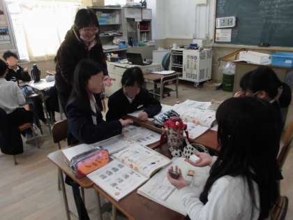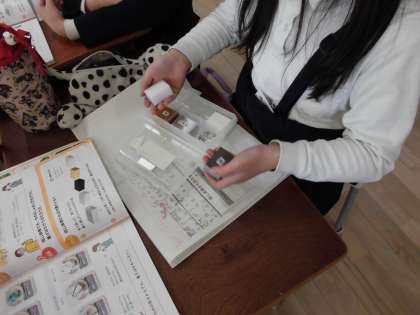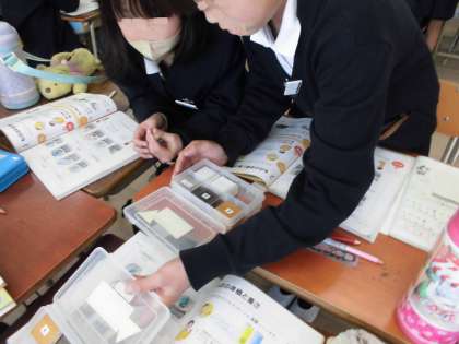 3年生は理科で「同じ体積のものの重さをくらべよう」の学習をしています。アルミや木や鉄などを手の上にのせて、持ってみて重さを感じています。「これが1位や。」とグループで確認しながら楽しそうに学習しています。
