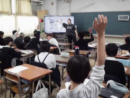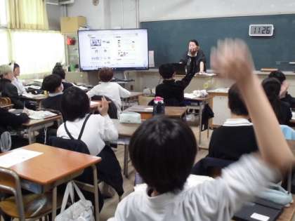 5年生は外国語で「お気に入りの場所を伝えよう」の学習をしています。教科書のプエルトリコに住むアナが、お気に入りの場所を英語で伝えている場面を聞きヒヤリングで理解するところです。みんなよく聞き取ってたくさんの手が挙がっています。