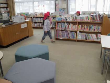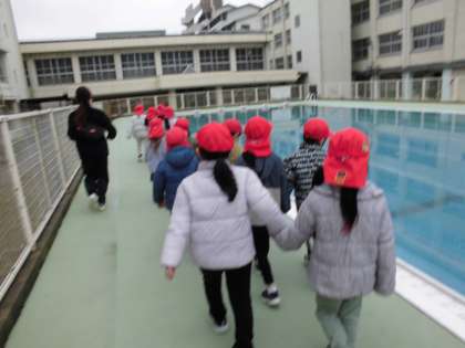 来年度1年生に入る瓜破保育所の5歳児が学校見学に来ました。小学校の大きな講堂や図書室、プールなどを見てまわりました。