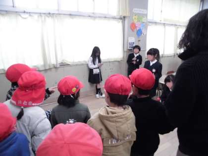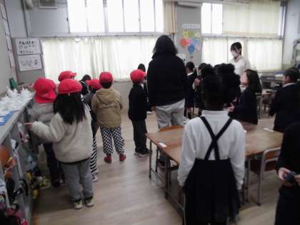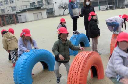 1年生の教室も見学し、昔遊びをしている1年生の様子を楽しそうに見ていました。雨だったので運動場や遊具では遊べませんでしたが、タイヤの横を通ったり、のぼったりしました。春から瓜破北小学校に通う5歳児もいるので、とてもいい体験になりました。