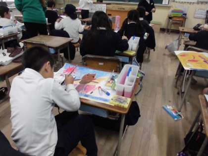 2年生は図工でお話の絵を絵の具で描いています。詳しく色づかいもきれいにできています。